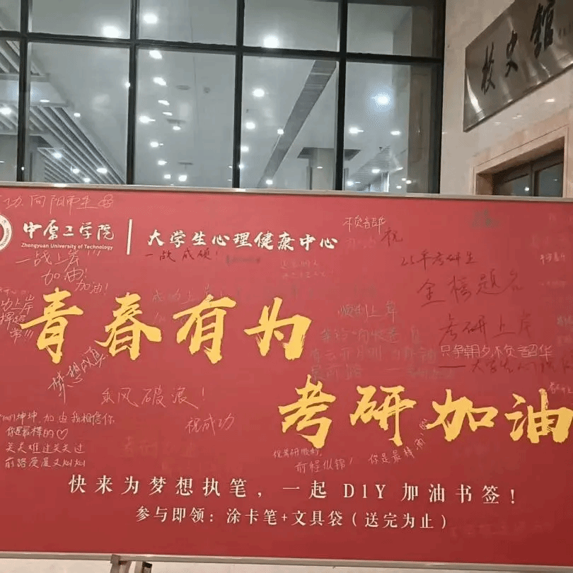 为切实缓解考研学子备考压力,传递校园关怀与正能量,12月6日,中原工学院大学生心理健康中心以“青春有为,考研加油”为主题,成功举办DIY书签寄语活动。活动专为备战研究生考试的学子搭建,吸引大批考研学子及为学长学姐送祝福的同学参与,DIY摊位前始终人头攒动,氛围热烈。