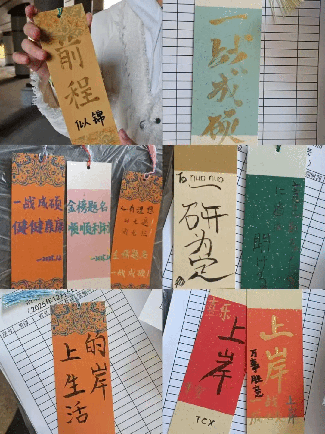 活动现场精心准备了宫廷、鎏金等多种风格的书签材料,搭配不同粗细的毛笔供同学们自由创作。考研学子们纷纷挥毫泼墨,写下“金榜题名”“一战成硕”“上生活的岸”等饱含期许的文字,既是对自己备考之路的鼓劲,也是对理想院校的憧憬;不少非考研同学也到场为学长学姐送上祝福,每一笔都承载着真挚的关怀。活动结束后,参与的考研学子还领取了涂卡笔与透明文具袋,为即将到来的考试做好实用准备。
