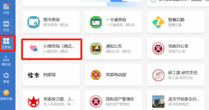 登录企业微信,打开工作台,找到心理咨询。
