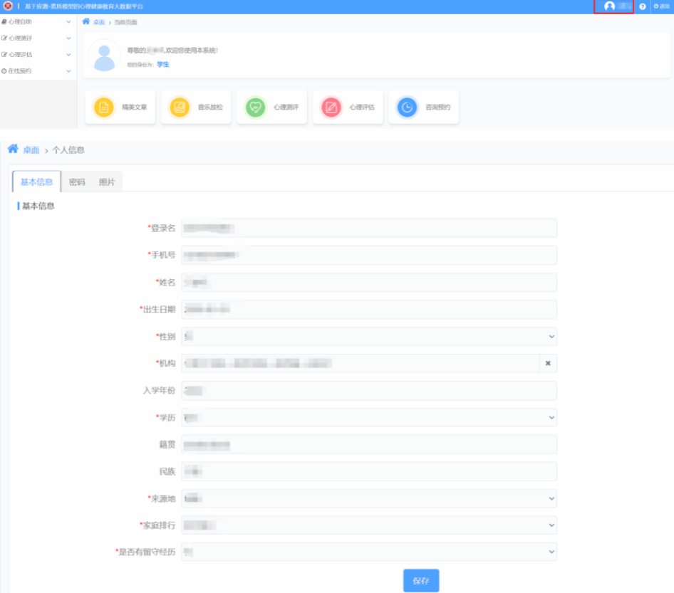 1.在开始测试之前请先完善个人信息,根据页面完善出生日期、民族、生源地、是否独生子女,确认无误点击“保存”。
