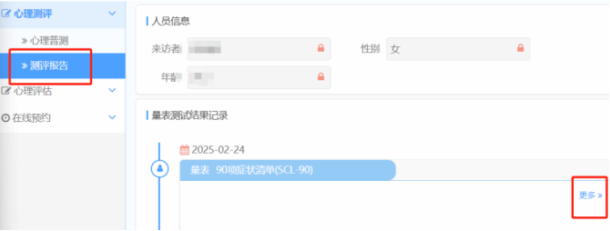 做完后可在左上角的菜单栏中的心理评测模块下的测评报告中点击更多查看评测结果。
