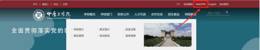打开中原工学院官网,右上角找到“WebVPN”