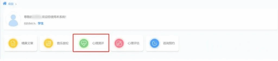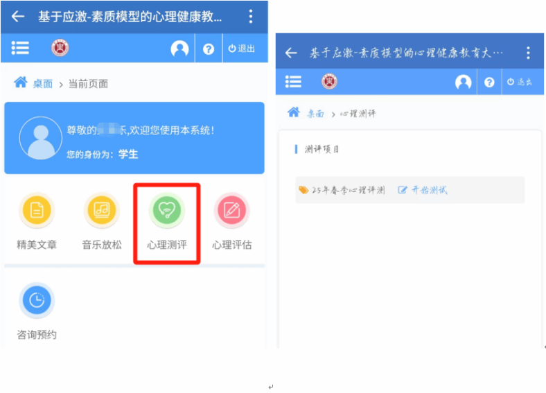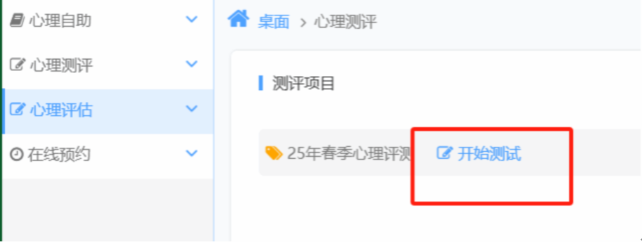 登录后可以看到【心理测评】模块,然后点击开始测试,如下图: