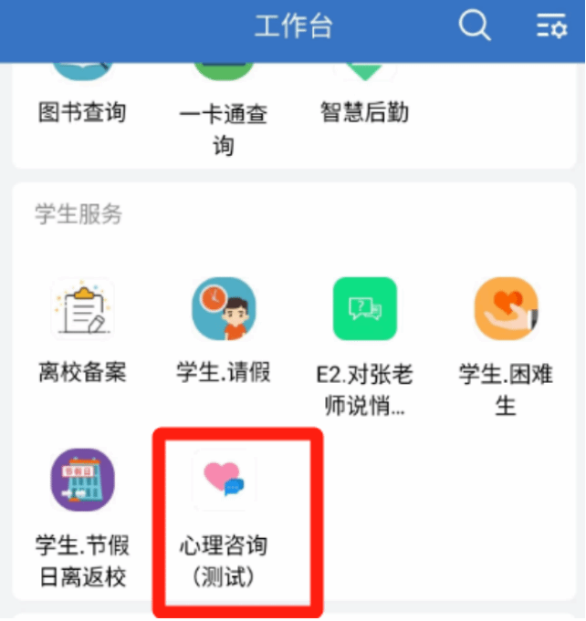 打开企业微信中的“工作台”找到“心理咨询(测试)”模块,点击进入