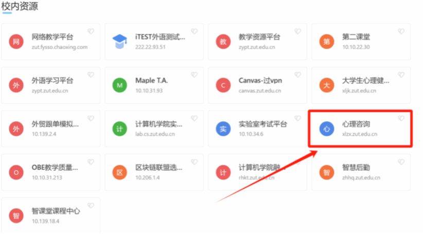 登录“WebVPN”后,在“校内资源”这一栏找到“心理咨询”